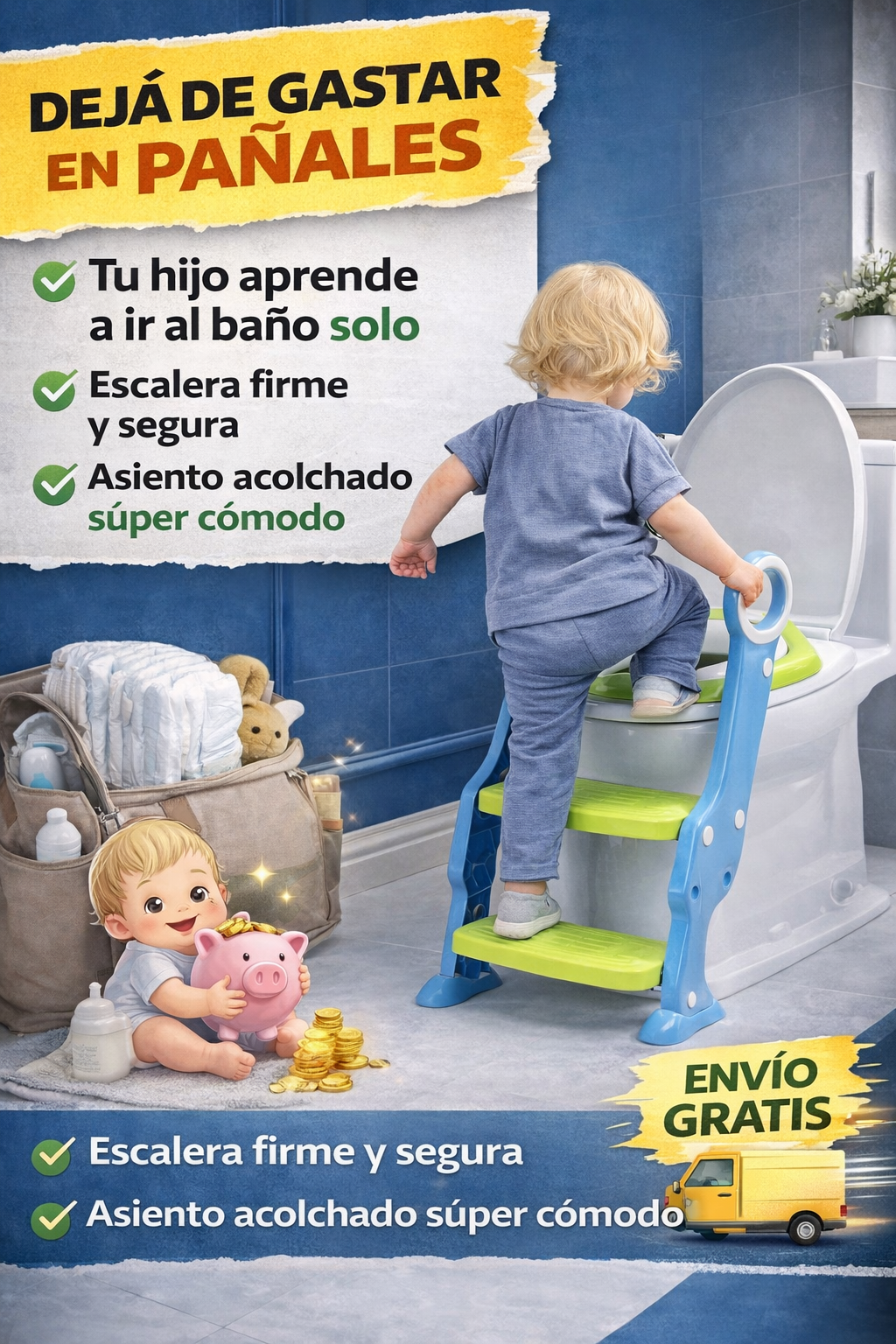 👶🚽 ¡Decile adiós a los pañales antes de lo que pensás! Muchos padres gastan una fortuna en pañales durante años, pero con la escalera acolchada para inodoro infantil tu hijo puede empezar a usar el baño de forma cómoda, segura y divertida. 🙌 Gracias a su escalera antideslizante y asiento suave, los chicos ganan confianza y autonomía mientras vos ahorrás dinero y evitás comprar tantos pañales. 💸✨ Es una solución práctica para acompañar el aprendizaje y hacer el proceso mucho más fácil para toda la familia. 🧸💙