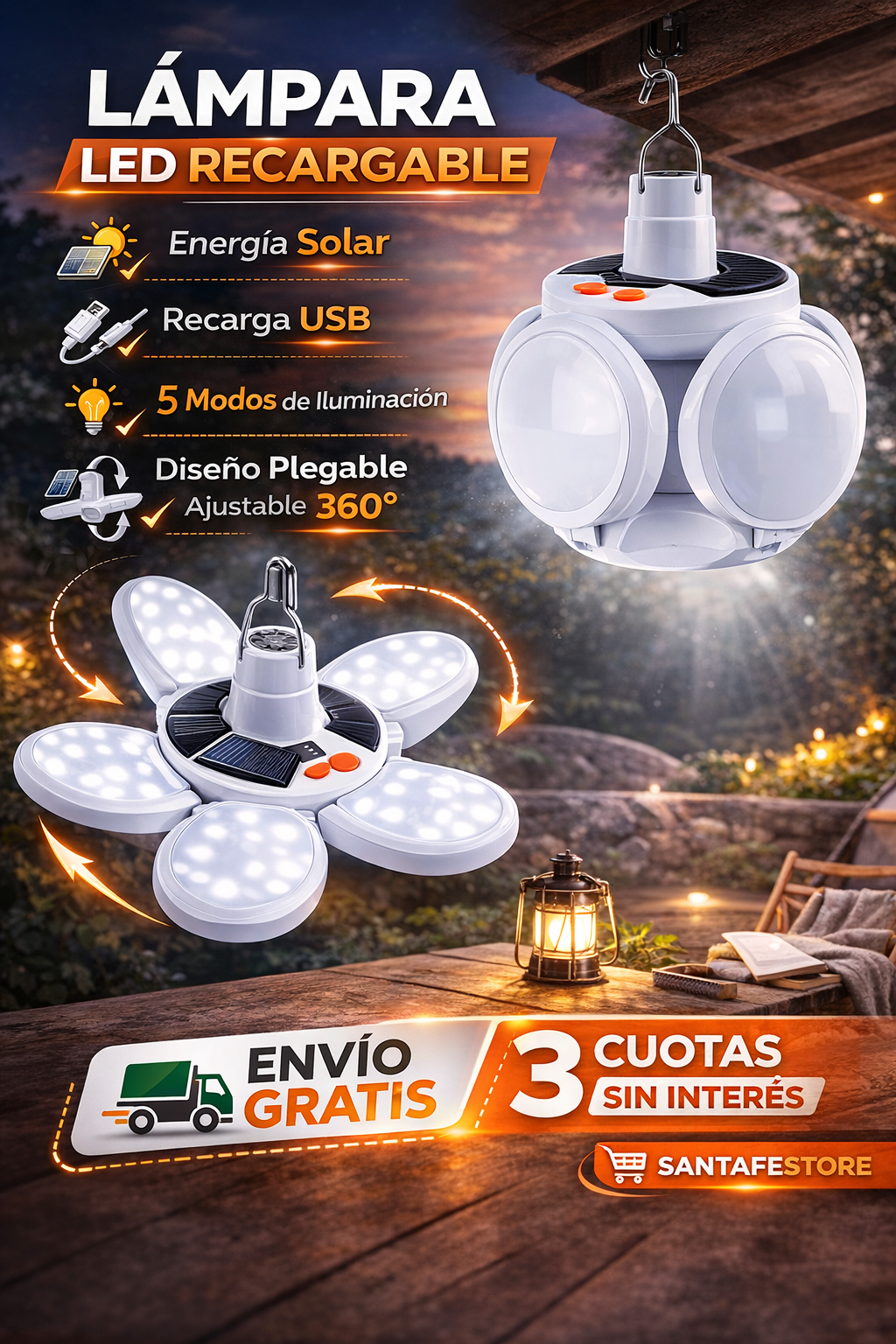 Gracias a su panel solar integrado, la lámpara se carga durante el día con la luz del sol y queda lista para iluminar durante la noche. También podés recargarla por USB, lo que la hace perfecta para usar en casa, en el patio, en el campo, en el camping o incluso en emergencias. 🔋
