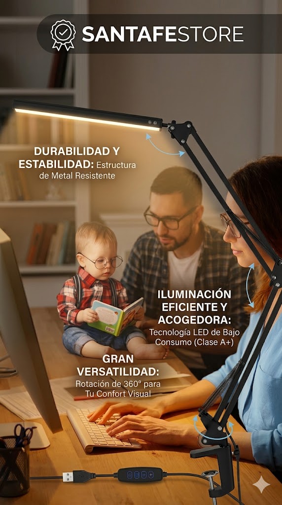 Con la Lámpara LED Articulada con Morsa SANTAFESTORE, transformás cualquier espacio en un lugar cómodo, iluminado y profesional ✨