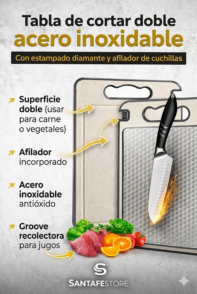 Presentamos la Tabla de Cocina 2 en 1 con Afilador Incorporado de Acero Inoxidable 🔪✨. Una sola herramienta que resuelve de una vez todos esos dolores de cabeza. Higiénica, duradera, antideslizante y con afilador integrado para que nunca más pierdas tiempo ni potencia al cortar.